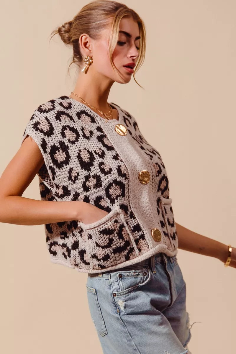 SO ME Big Metal Button Front Leopard Sweater Vest Top
